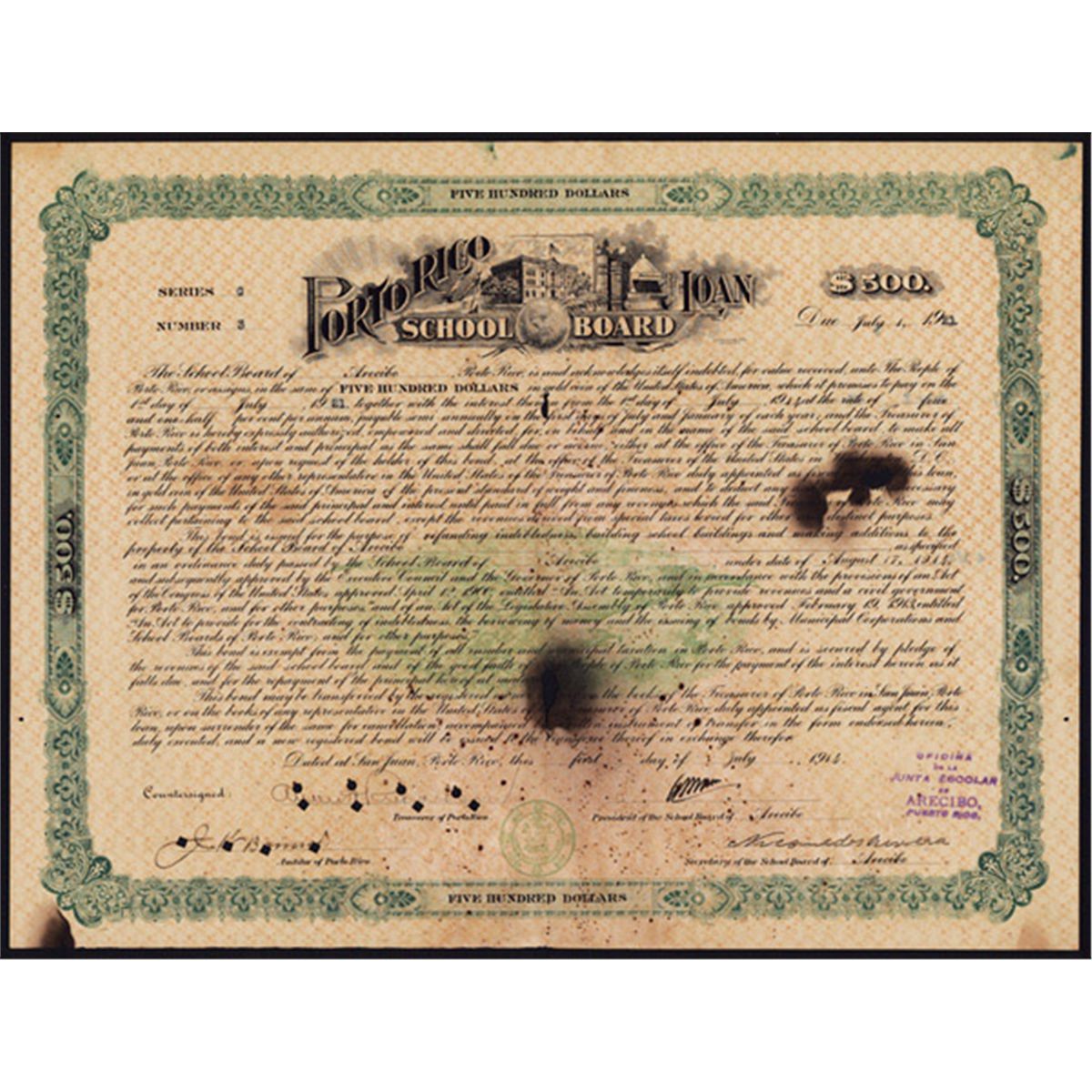 Puerto Rico, 1914, $500, Issued and punch cancelled bond, Black with green border, light red underprint, school building on top, VG to Fine condition with fly spots and ink burns in middle, otherwise very rare.