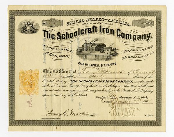 Marquette, L.S. Michigan. 400 Shares, I/U, Black printing with factory in middle and Michigan arms at top left, S/N 23, VF condition, 25 cent U.S.I.R. Imprinted revenue stamp at left, printer: Hatch & Co.. Extremely rare Michigan mining stock certificate from a new estate find.