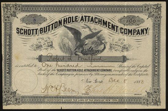 New York, 1883, 100 Shares, Issued and Uncancelled Stock, S/N #8, Bald Eagle feeding three chicks in nest mid center, VF condition, Chas. F. Ketchum & Co.