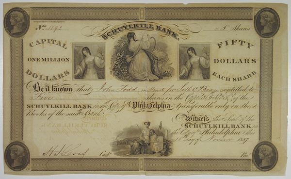 Pennsylvania, 1837. 5 Shares I/U Capital Stock Certificate, Black text with black border, Allegorical woman flanked by portraits of a woman. Fine condition with Archivally reinforced and repaired splitting along center fold line. DUB&S.