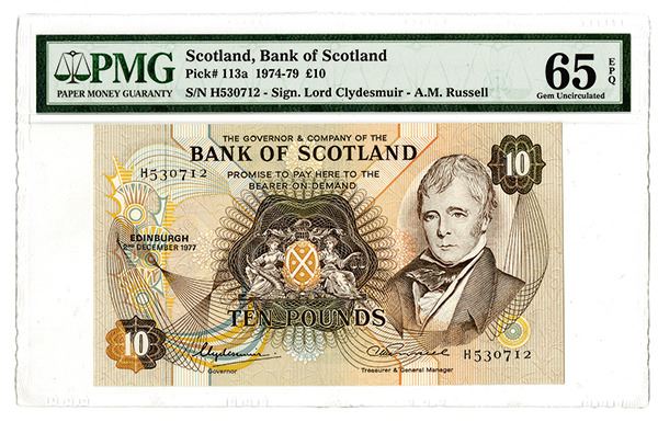 Scotland, 1977, 10 Pounds, P-113a Issued Banknote, Portrait on front, Ship on back, S/N H530712, Signed by Lord Clydesmuir - A.M. Russell, PMG graded Gem Unc condition 65 EPQ.