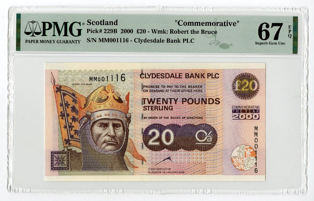 Scotland, 2000. 20 Pounds, P-229B Issued Banknote. Dark brown on m/c underprint with Robert the Bruce at left. S/N MM001116. PMG graded Superb Gem Uncirculated 67 EPQ. 1 note grades higher in the PMG census out of 22 graded. This is also the highest graded note to be offered at auction as listed in the Track and Price census.