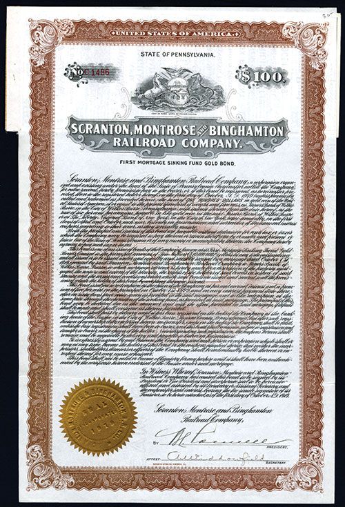 Pennsylvania, 1919, $100, #C1486, 1st Mortgage Sinking Fund Gold Issued Bond, Vertical format, Coupons Attached, VF-XF condition, Scranton Litho. Listed railroad and bond in Cox.