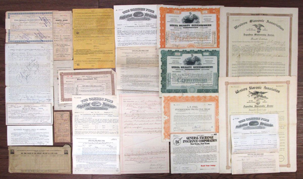 Lot of 20 Items, Includes: Protective Trust Subscription Table, 1924; Deming Investment Co., 1905; Warranty Deed, 1901; Steel Realty Development Corp., 1922; Camden Fire Insurance Association Policy, 1924 and more. Items range from Good to VF condition. (20). Sold "AS IS" no returns accepted.