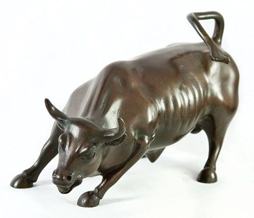 One of the very few artist’s reproductions of the famous sculpture made in three sizes and signed by DiModica. The sculpture is 7 tall and 11 long, very handsome and should be seen. Also a writing by the artist (copy) titled The Bull copy of a news story, and a photocopy of a group surrounding the sculpture at Bowling Green. A very fine piece!