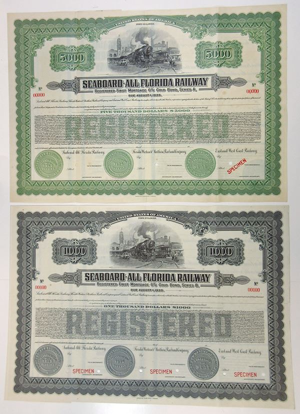 Florida. Pair of Specimen Bonds 1) 1926, $1,000 Registered 6% Series B, 1st Mortgage Gold Specimen Bond, Black print on gray border and under tint in horizontal format. 2) 1925, $5,000 Registered 6% Series A, 1st Mortgage Gold Specimen Bond, Black print on green border and under tint in horizontal format. Both bonds have a Locomotive leaving station at top with city in background, Specimen overprints and POC's, VF-XF condition, ABNC. Both are only known as specimens in Cox, the $5000, bond has not previously been seen. Both rare. 2 Pieces.