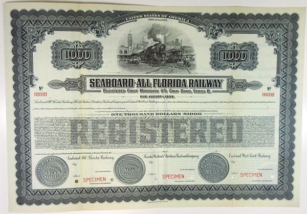 Seaboard-All Florida Railway 1925 $1,000 Registered 6% Specimen Bond, XF, ABNC.