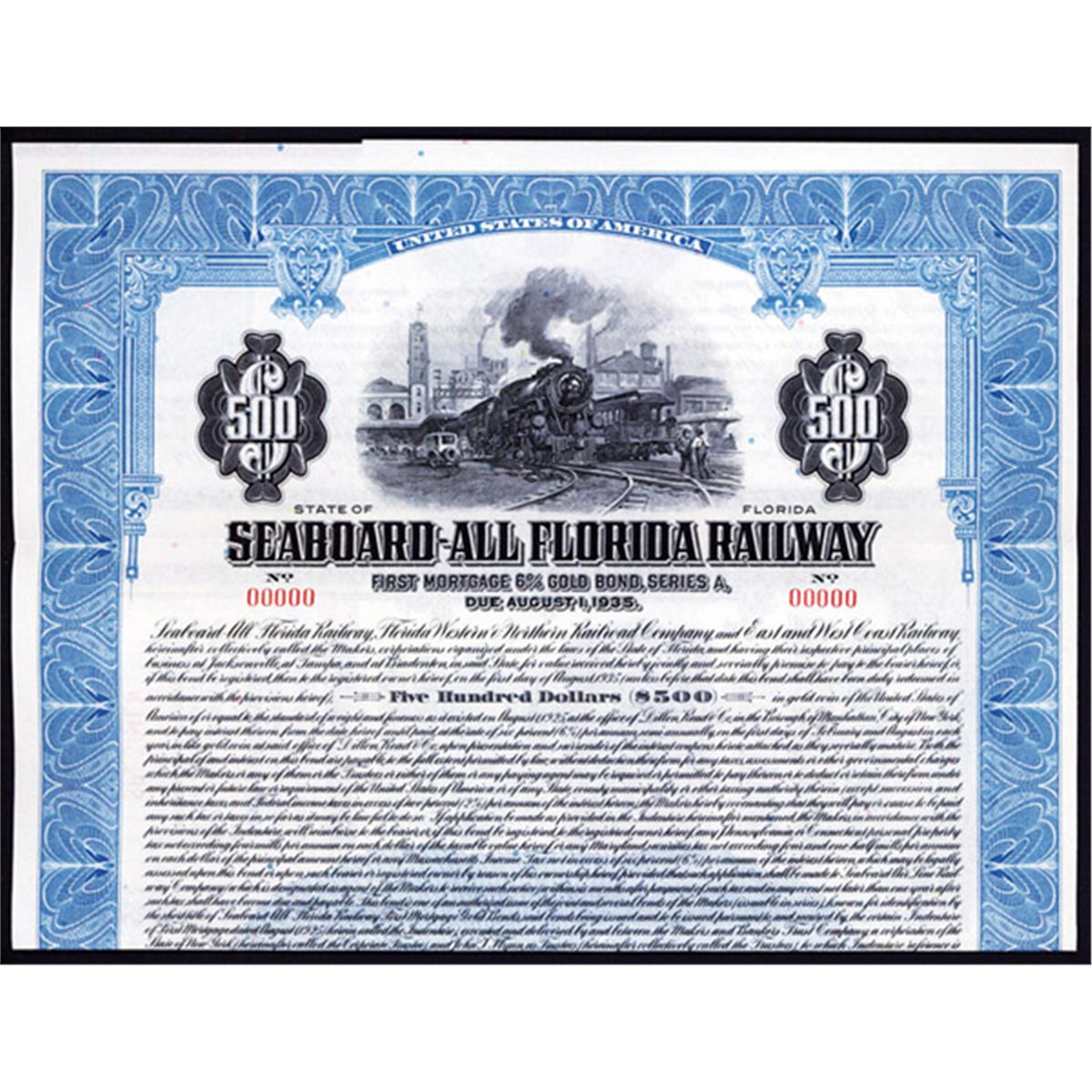 Florida, 1925, $500, Series A, 1st Mortgage 6% Gold Specimen Bond, Black on light blue border and underprint, Locomotive leaving station top center, Coupons attached, VF-XF condition, ABNC.