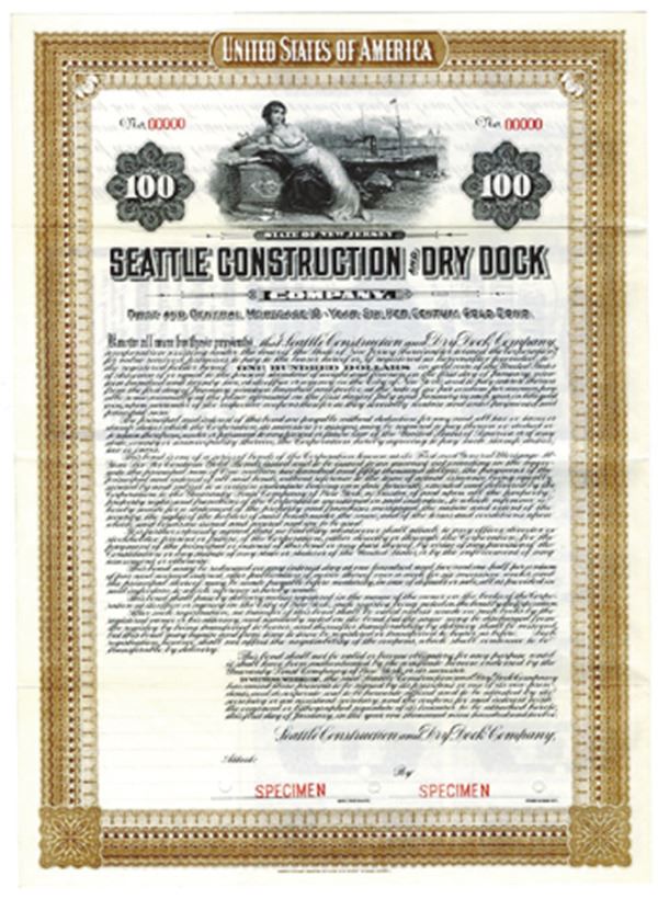 New Jersey. $100 Specimen 6% 1st and General Mortgage Gold Coupon Bond, Black print on brown border and under tint, Allegorical woman reclining with a boat behind her at top, Specimen overprints and POC's, VF-XF condition, ABNC.