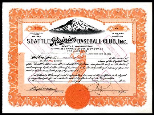 Seattle, Washington, 1940, 5 Shares, Issued and ink cancelled, Black on orange border and underprint, view of Mount Ranier in middle top with underprint of swinging baseball batter as underprint in middle, S/N 327, XF condition. Attractive and scarce baseball certificate. Farwest, printer.