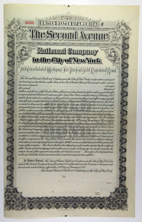 New York. $-Odd Specimen 5% Registered First Consolidated Mortgage Gold Bond, Black text with ornate brown border and underprint. Red "0000" serial number, POC's, VF condition. The Second Avenue Railroad was a street railway company in Manhattan. Unlisted railroad bond in Cox. Unique in Archives. This is it.