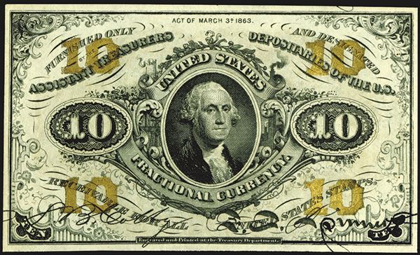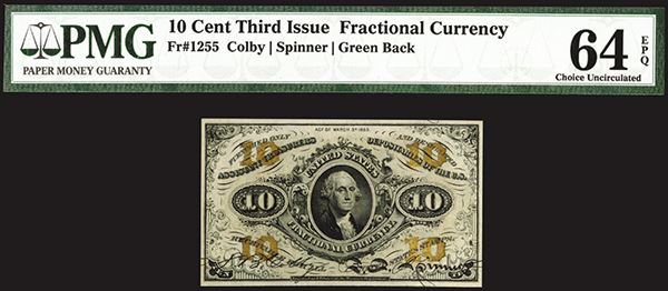 Fr.1255. 10 Cent Third Issue. Colby, Spinner. Green back. PMG Choice Unc. 64. EPQ.