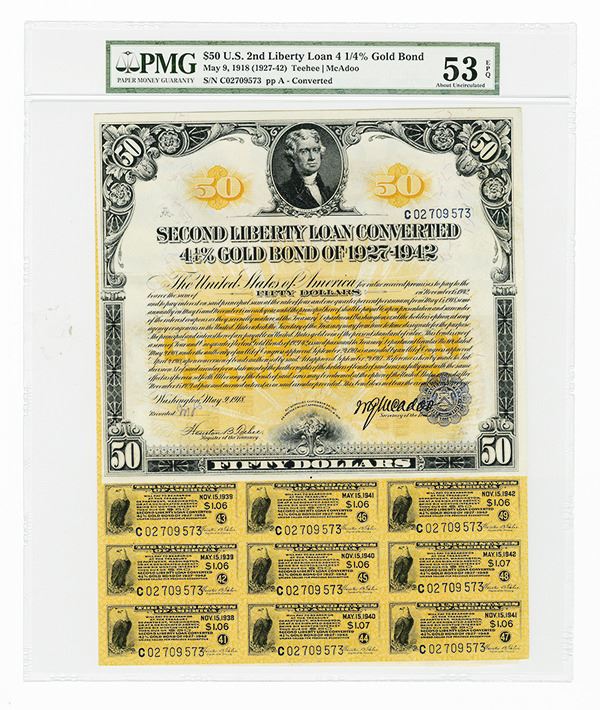 $50 Second Liberty Loan Converted 4.25 %, Gold Bond of 1927-1942 Issue May 9, 1918. Ex. Chet Krause Collection. PMG AU 53 EPQ. Coupons 14-49 attached. Beautiful Golden Orange inks adorn this Gold Bond of WWI. SN. C02709573.
