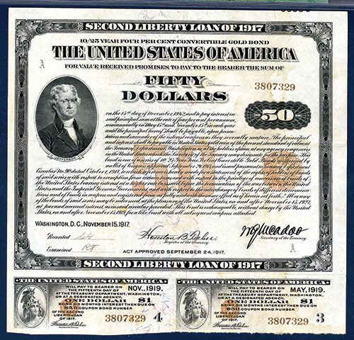 Washington, D.C., November 15, 1917 (Act approved September 24, 1917, $50, 2nd Liberty Loan 4% Gold Bond, Issued, 2 coupons attached, Jefferson on top left, Liberty on each coupon, back brown with standing Liberty, Tehee | Mcadoo signatures, S/N 3807329, PMG graded Very Fine 30 NET with a notation of a light water stain that does not detract from the appearance, rare bond in any condition that rarely appears in auction. BEP.