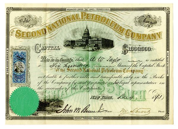 Pennsylvania. 600 Shares Capitol Stock Issued and Uncanceled Certificate. Multi-colored printed certificate with a black border. Vignette of the Capitol Building at top of certificate above an American Bald Eagle. 25 cent revenue stamp on left side of certificate. VF-XF condition.