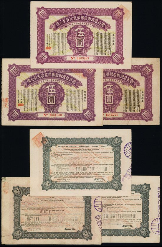 China, 1926, 5 Dollar Canton Currency, Issued Loans, Black on purple border and yellow underprint, No vignette, red #'s 0969427, 1661630, 1515771, VF condition, Funds used to help finance the construction of the Port of Whampoa.