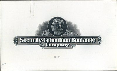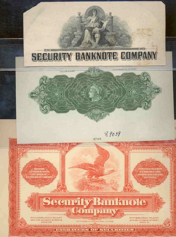 1920-1950's. 4 different letterheads, calendar heads, color chart pages and stock or bond certificate title and vignette heading. One of the items is a transition letterhead of Security-Columbian BNC with "Liberty" on top, printed on card. Condition varies between VF and choice uncirculated. Scarce group. SBNC, SCBNC.