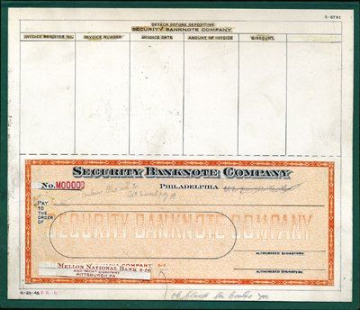 1948-1950. Interesting production material for Security BNC check or draft and annual report. Includes a model for a SBNC check in orange mounted in a green folder with the text without border in intaglio proof. Also included is the production file for a 1950 SBNC Annual Report with the hand drawn model, the corresponding proof and a specimen of the final version of the report booklet. A large SBNC proof label that measures 4.5 by 4.5 inches is also included. Over all condition is XF to choice. Rare and interesting production material. 6 different proofs and models are included in this lot. SBNC.