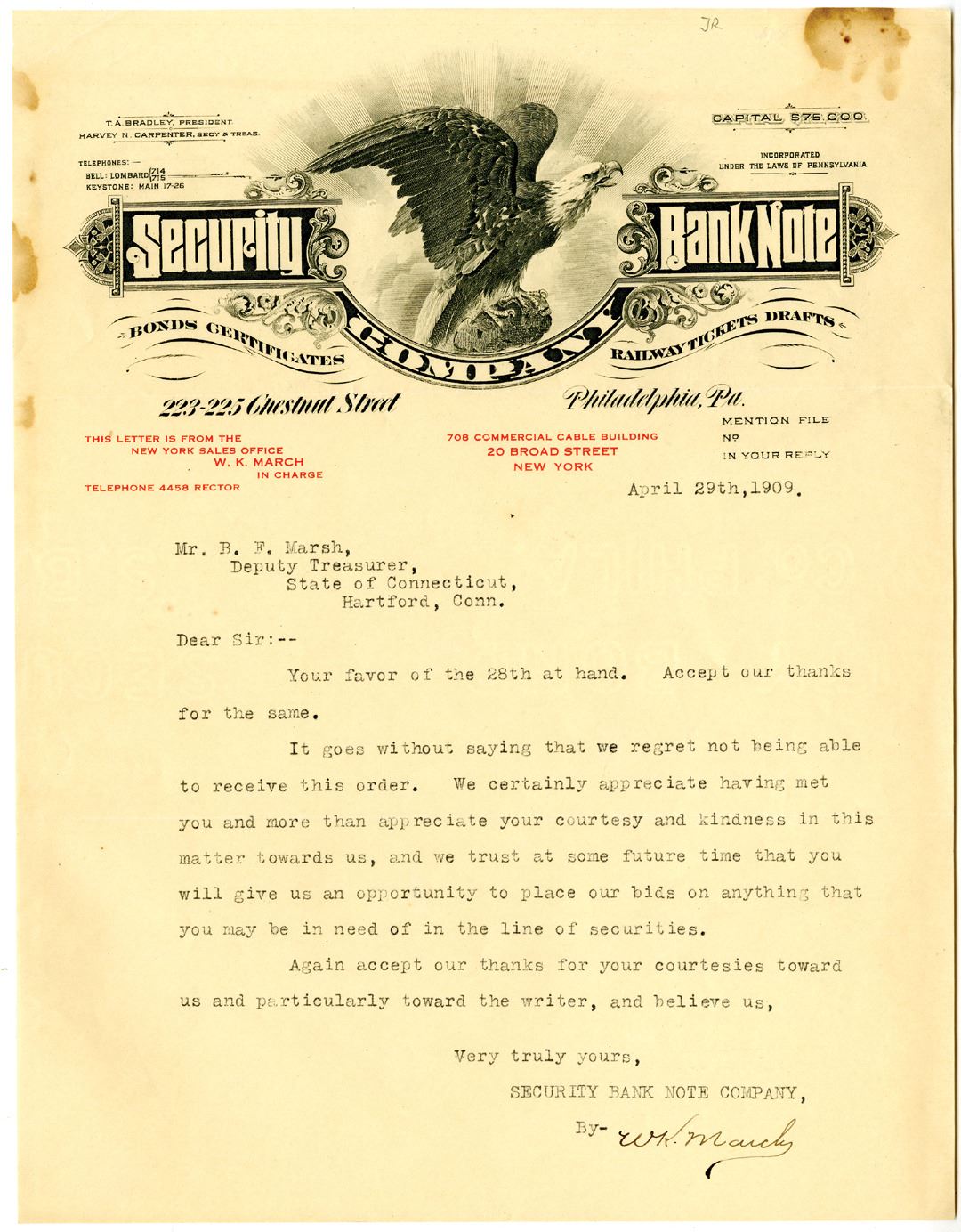 Pennsylvania, 1909. Typewritten letter on Security Bank Note Co. letterhead featuring an ornate design and eagle at top center. The letter regards a bid placed for Deputy Treasurer, State of Connecticut, Mr. B. F. Marsh's business, and highlights the printing company's wishes for a future relationship. Fine - VF condition with staining at top margin. Unique piece of printing ephemera.