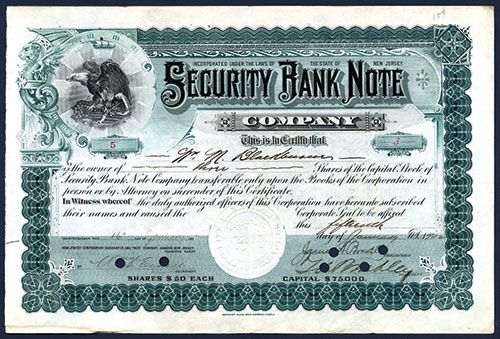 New Jersey, 1902, 3 Shares, Issued and POC's in signature blocks, Signed by Thomas Bradley as president, Well known security printer that merged with Columbian BNC to form Security-Columbian BNC and then eventually became part of the U.S. Banknote and ABN corporate mergers. S/N 5, Black on green border and underprint, Patriotic eagle and shield on upper left, ornate title, VF to Choice VF condition, First time seen by cataloger. SBNC.