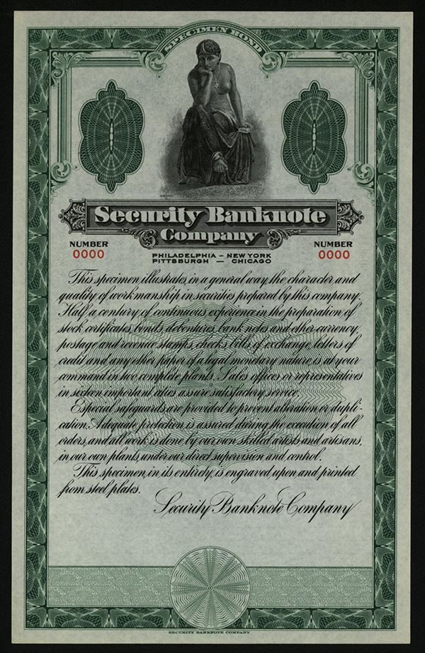 Philadelphia, Pennsylvania. ND (ca.1910-30), Odd Denomination. Bond look-alike advertising note or bond. Face has green border and underprint with allegorical woman on top, title beneath and "Specimen Bond" above. It is 5 by 8 inches. "0000" serial numbers and is uncancelled. Back appears like a normal bond. Text on face describes services offered by SBNC. Uncirculated to CU condition. SBNC. Scarce advertising piece.