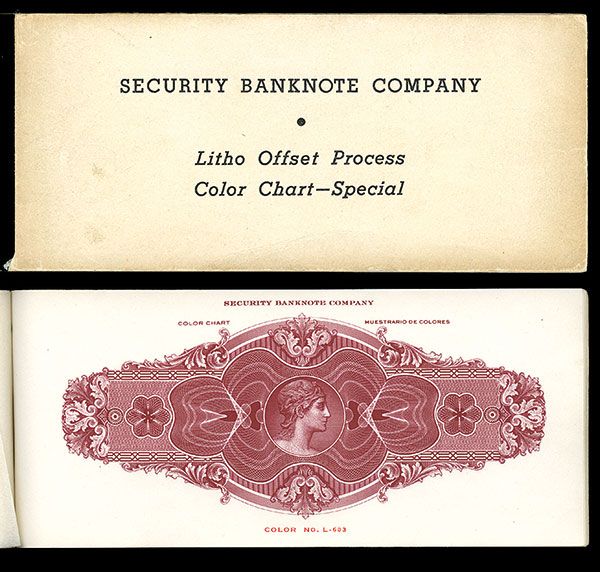 Philadelphia, ND (ca.1900-1920), Color sample book by SBNC with 22 pages, all with the same design but different colors, Printed in Spanish and English, ornate cycloid design with classical profile of person with helmet facing right, Uncirculated condition. Rare and first time seen by cataloger. Discovered in a small Hong Kong coin dealers inventory and possibly the first time this design has been offered in auction. Rare if not unique and in exceptional condition and complete. SBNC.