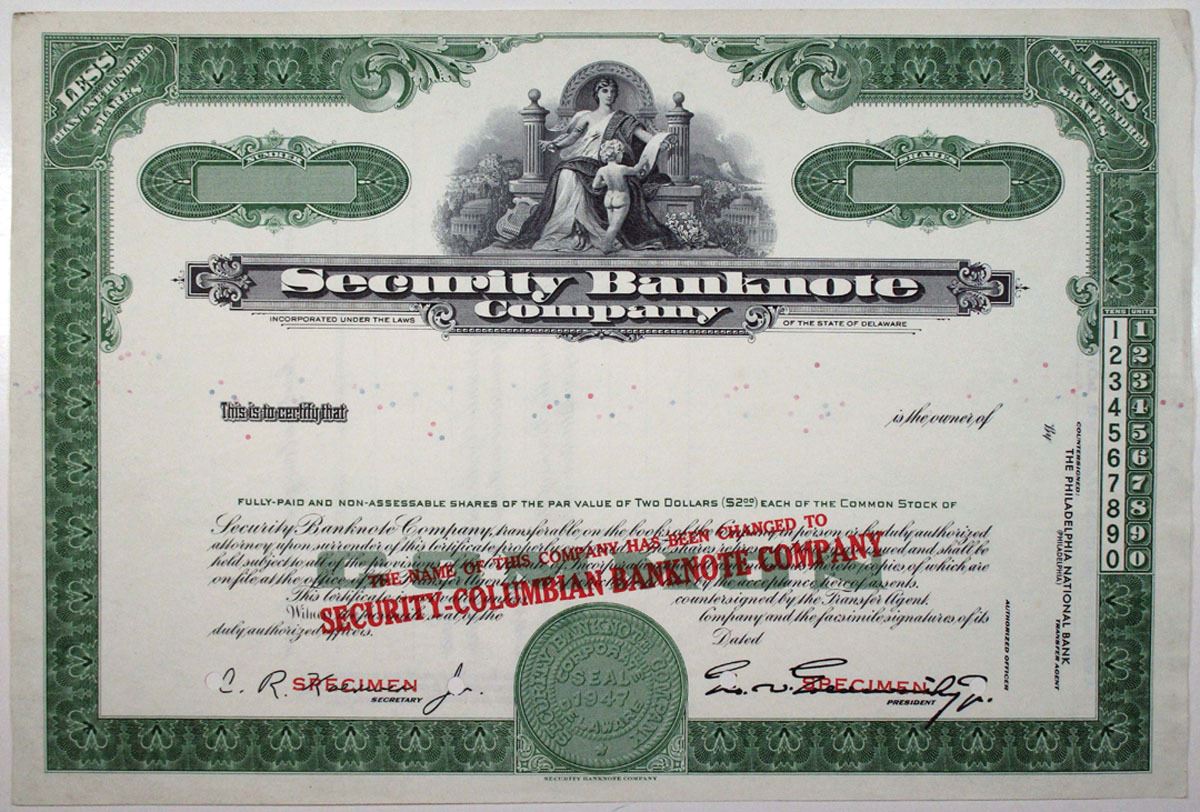 Delaware, ND (1950s). <100 Shares Specimen Stock Certificate, Columbian BNC and Security BNC merged in 1957. Black text with green border and underprint, Allegorical seated woman with standing baby at top center. Transition certificate after merger with name change overprinted "Name of this company has been changed to Security-Columbian Banknote Co.". The companies merged in 1957. Specimen overprints, POC's, Uncirculated. SBNC.