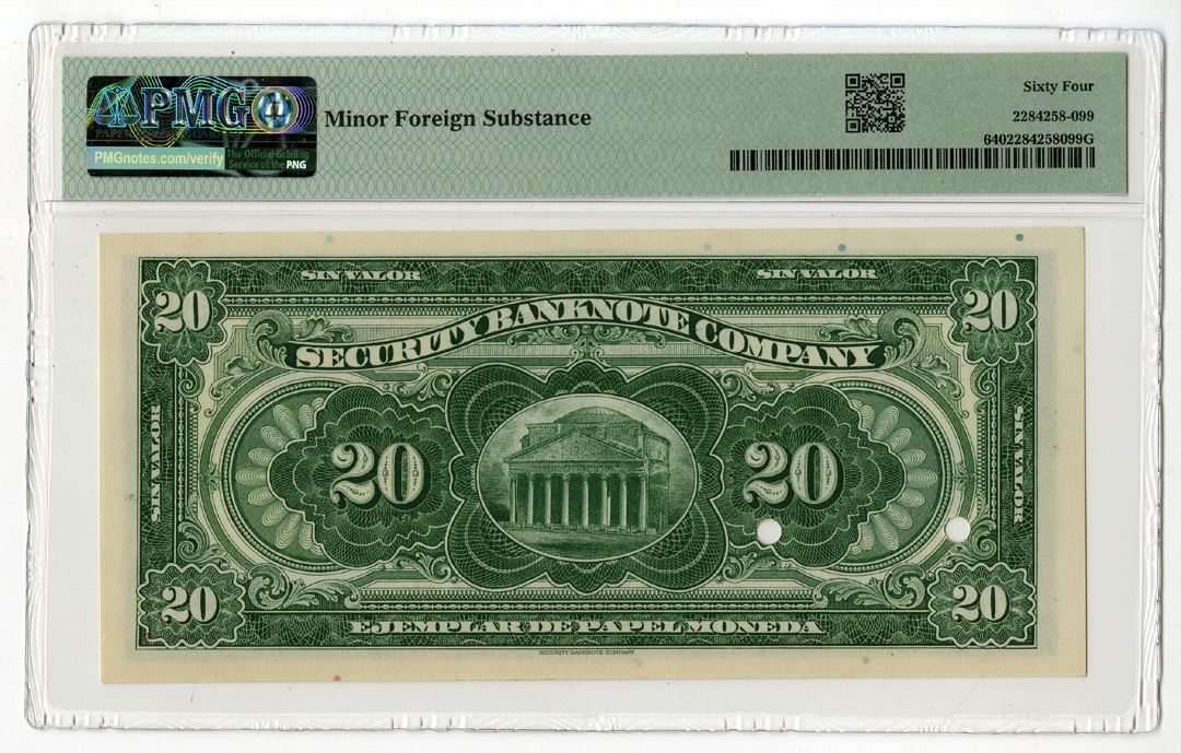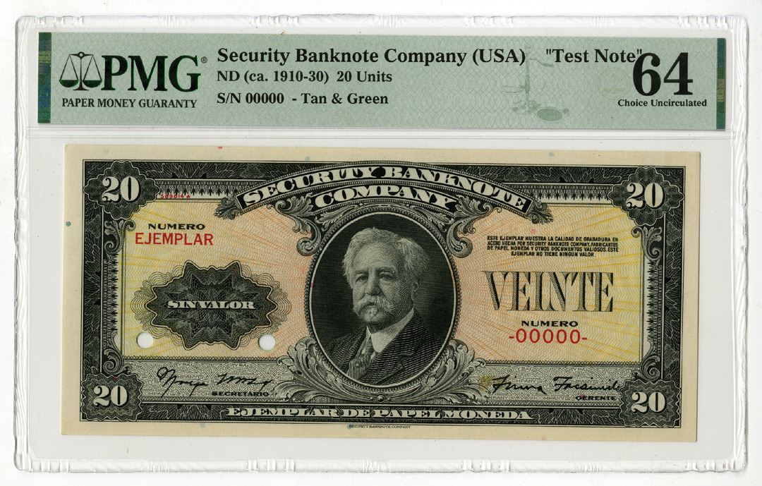 Philadelphia, Pennsylvania. ND (ca.1910-30). 20 Units Test Note, Black on orange and tan underprint with portrait of man at center, Back is green with bank title at top, S/N 0000, PMG graded Choice Uncirculated 64 with comment "Minor Foreign Substance," SBNC
