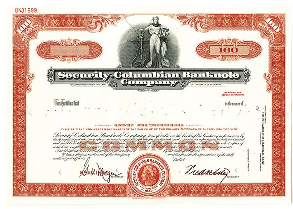 Philadelphia, PA. (Inc. in Delaware), ND (19750-60's). 100 Shares Specimen Stock Certificate, Black text with brown border and underprint, Allegorical woman at top with propeller and company logo. Red specimen overprints and POCs. VF condition, SCBN. Well known security printer and engraver.