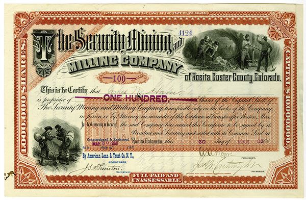 Rosita, Custer County, Colorado. March 30, 1888. 100 Shares, I/U Stock certificate, Black on umber border and underprint, Mining scene on top right and 2 miners on lower left looking at gold, VF to XF condition, Attractive design. ABNC. Scarce mining certificate.