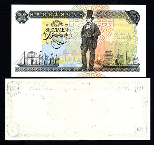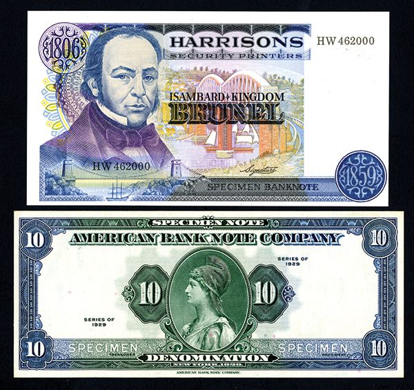 Security Printer Advertising Banknote Pair. Lot of 2 notes, Includes American Bank Note Company - Specimen Note - 10 Denomination, Blue, green, blue color scheme, blank back, printed on planchetted paper and Harrisons Security Printers - Specimen Banknote, "Isambard - Kingdom Brunel, portrait of Harrison on face, back with man flanked by two old steamships. Both CU to Gem Uncirculated.