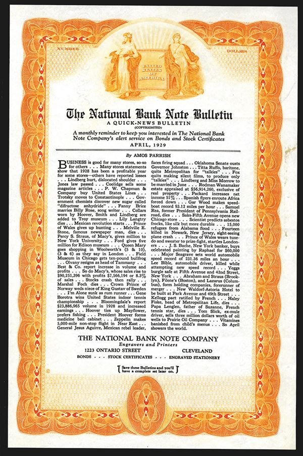 Lot of 9 Advertising sheets - news bulletins, all different. Cleveland, Ohio. April to December 1929. Written by Amos Parrish. Published by the National Bank Note Company, Cleveland. Creative advertising using intaglio printed Bond face with the current news for that month including the historic October Stock Market crash. Evidently the October issue was written before the end of the month. The November 1929 issue reports on the Stock Market Crash where 240 stocks lost $9 billion. Formerly folded three times, into quarters. Printed on one side, on watermarked stock. Letterpress text at center of large engraved border with a different engraved border used in a different color for each issue. 9 issues. Historic and tumultuous time period with considerable information that deserves further study.