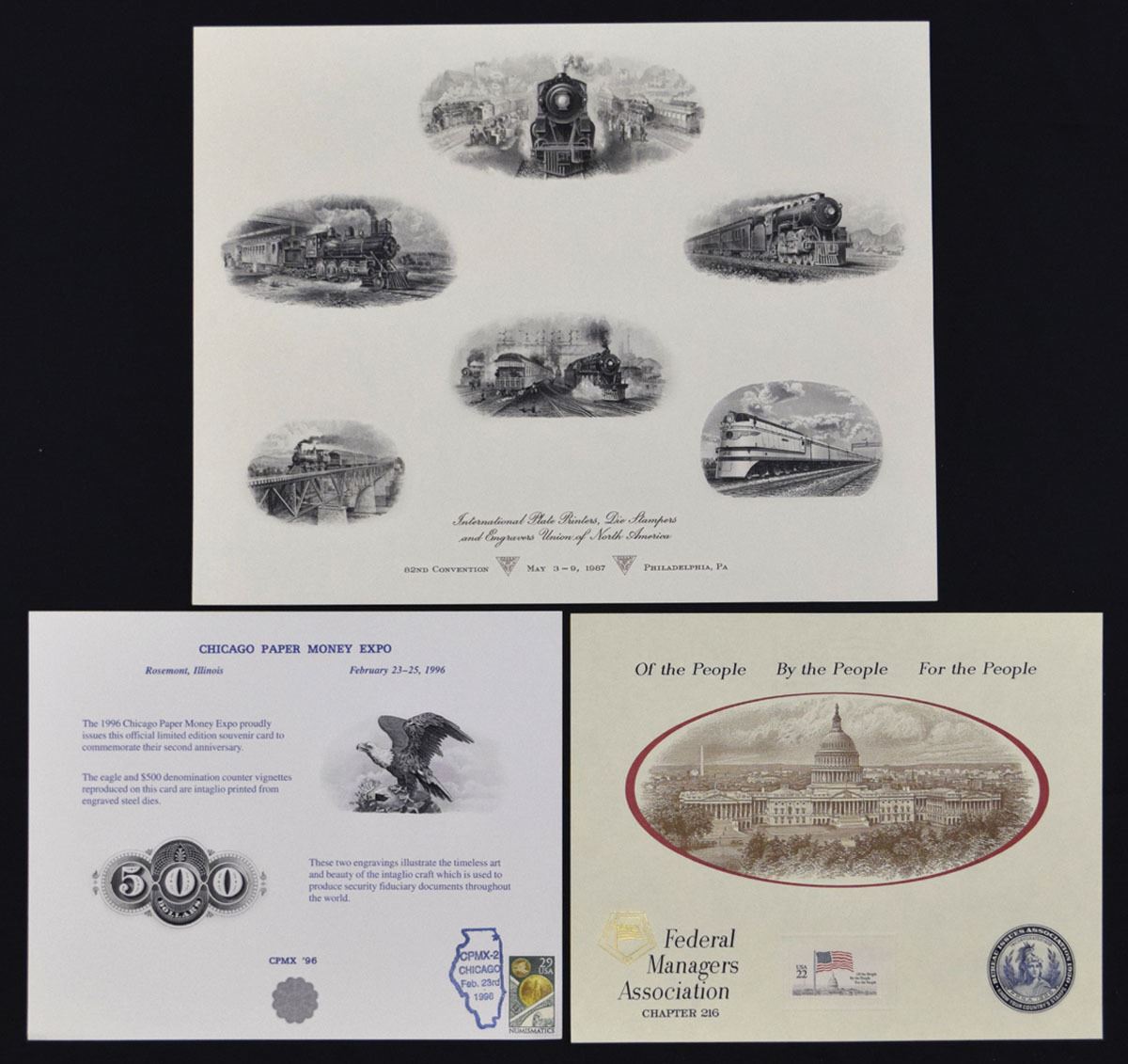 Illinois, Washington, D.C., Pennsylvania. 1980-90s, Lot of 3 Engraved Souvenir Cards, Includes: International Plate Printers, Die Stampers & Engravers Union of North America Convention Souvenir Card, Philadelphia, May 3–9, 1937, featuring multiple locomotive vignettes; Chicago Paper Money Expo Souvenir Card, 1996, with eagle and 500 numeral design; Federal Managers Association, Chapter 216 Print, ND (ca. 1990s), with U.S. Capitol vignette and patriotic motto. Cards are in AU to UNC condition. (3). Sold "AS IS" no returns accepted.