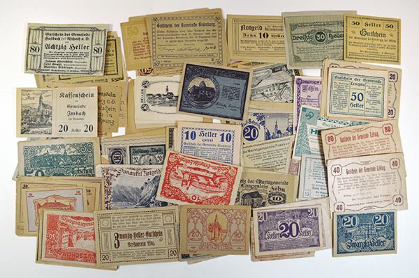 Austria, Notgeld selection. Many city issues including: Frankenmarkt, Freinberg, Campern, Gmunden, Grunau, Grunbach, Grunburg, Gunskirchen, Gutenbrunn, Haibach, Helpfau-Uttendorf, Imbach, Kematen, Kirchberg, Kirchdorf, Kirchheim, Kleinmunchen, Krampelstein, Kronstorf, Lambrechten, Langenlois, Lasberg, Lebing, Lengau, Liebenau, Linz, Lohnsburg, Luftenberg, Manglburg and others. Many printed on fragile pulp paper. Mostly VF-EF or better. Just over 125 pieces.