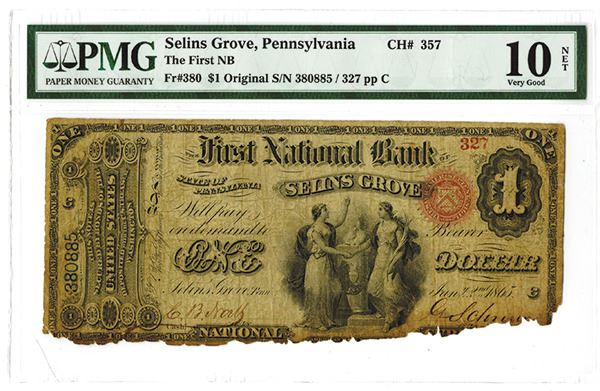 Selins Grove, PA. 1865, $1, Small Red Seal, Fr#357, S/N 380885 / 327 pp C, PMG graded Very Good 10 NET with note of edge damage on bottom margin. Only 3 examples of the 1865 original charter $1 exist. Rare note in any condition.