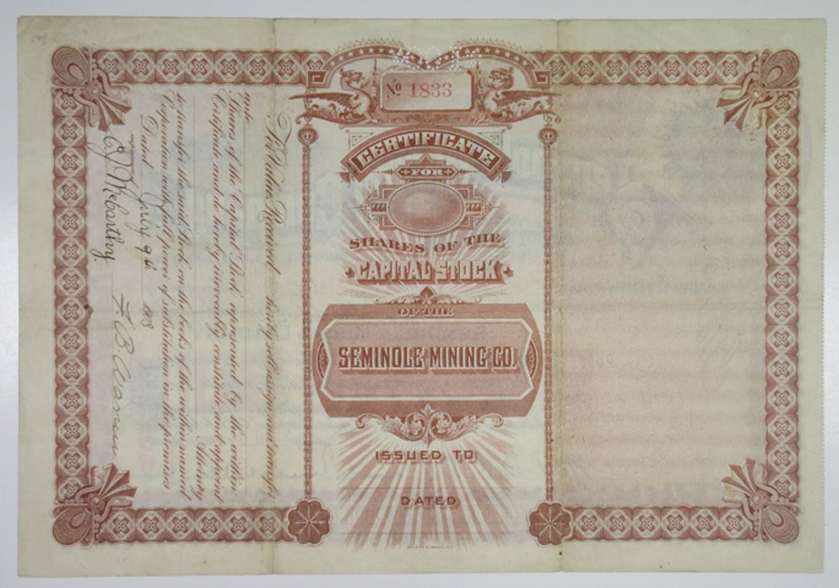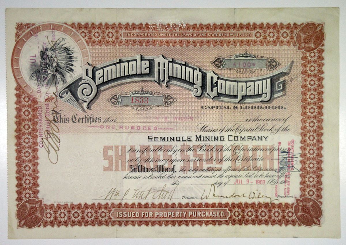 New Jersey, 1903. 100 Shares Capital Stock I/U Stock Certificate, Black on brown border and underprint, Company title at top with image of Native Chief at top left corner, S/N 1833, Fine-VF condition with toning around margins, Snyder Black, NY.