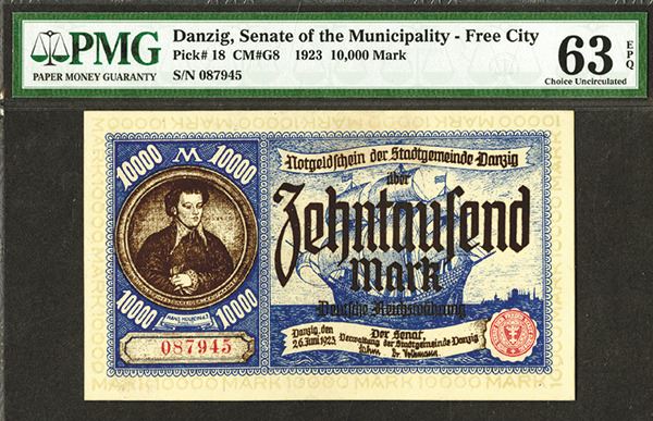 Danzig. 10000 Mark. P-18. Ship at right center. PMG graded Choice Uncirculated 63 EPQ.