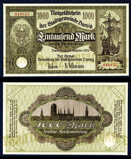 Danzig, 1922, 1000 Mark, P-15a, Issued banknote, Olive green and dark brown, S/N 046857, Attractive note for grade with bright colors, sharp corners and excellent paper quality. Rare note in this high condition which appears Uncirculated at first glance.