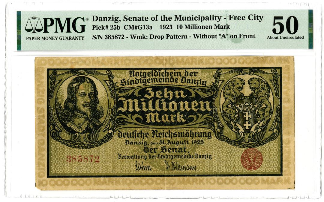 Danzig.... 1923. 10 Millionen Mark, P-25b CM#G13a, Black and green, S/N 385872, Watermark: Drop Pattern - Without "A" on Front, PMG graded About Uncirculated 50 with comment "Corner Tip Missing".