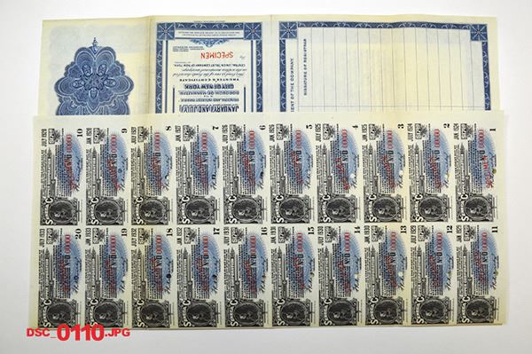 New York. $500 Specimen 7% First Mortgage Convertible Gold Coupon Bond. Black print with a large sized blue border and under tint. Vignette of men working in a mine at top of page. Specimen overprints, POC's, VF-XF condition with all coupons attached.