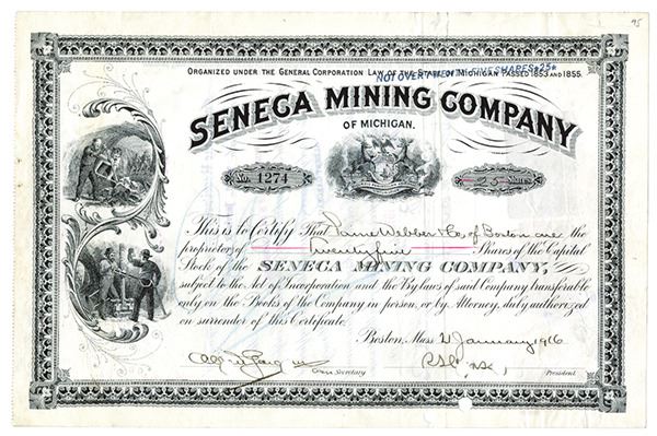 Michigan. 25 Shares Capital Stock Issued and Cancelled Stock Certificate, Black print on black border, Seal of Michigan at top under company title and images if men in mine with large drill along left border, POC's along bottom, Fine-VF condition.