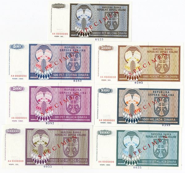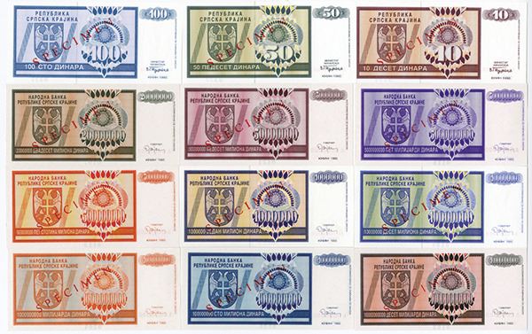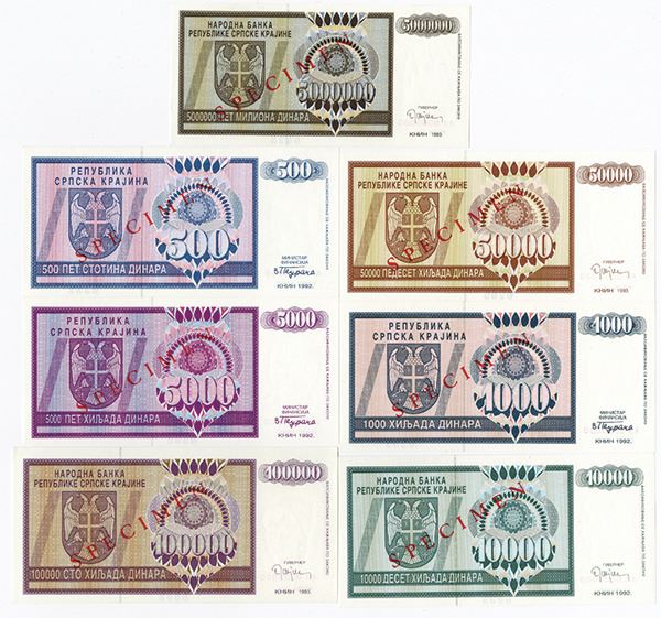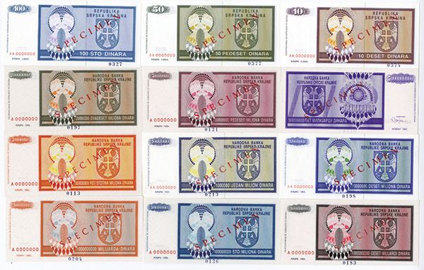 Serbia, Lot of 19 notes, Includes P-R1 to P-R19, 10 to 10 Billion Dinara, all specimens. All in Uncirculated to Gem Uncirculated, Scarce as a set.
