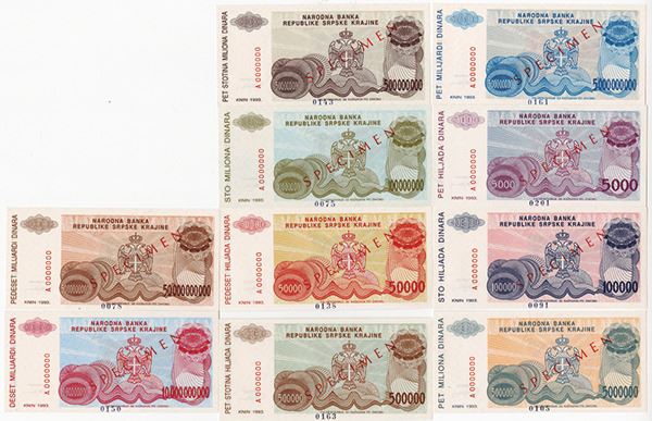 Serbia, Lot of 10 notes, Includes R20-R29, All specimens, 5000 to 50 Billion Dinara. All in Uncirculated to CU.