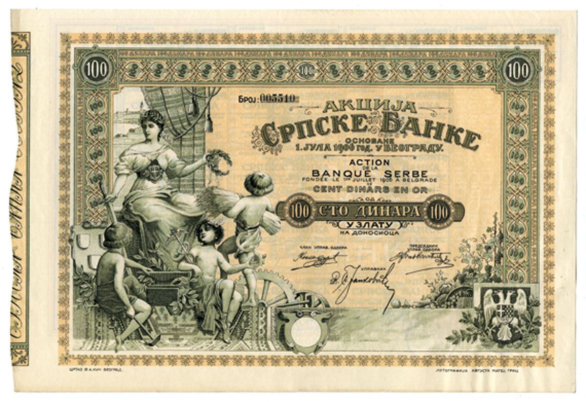 Serbia, 1906. One Share I/U Bond for 100 Dinars, in French and Cyrillic. Coupon sheet included. Black text with ornate border, Large illustration at left of woman with a trio of cherubs. VF condition.