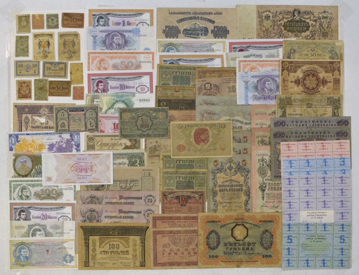 Russia, Belarus, Ukraine, and Serbia. Lot of 70+ Issued Banknotes, Scrip Notes, and Consumer Cards, Includes: ND (1918), Russian State Treasury Notes 50 Karbovantsiv, P-5a; ND (1918), 50 Karbovantsiv, P-6b; Russian State Credit Notes, 1909, 3 Rubles, P-9b, 1909; 1905 (1909-12), 5 Rubles, P-10 (3); 1909 (1903-12), 10 Rubles, P-11a (Timashev) & P-11b (2 - Konshin); Currency Tokens, 1919, 5000 Rubles, P-S419d; State Treasury Notes, 1938, 1 Ruble, P-213a; 1938, 3 Rubles, P-214a; Russian State Credit Notes, ND (1909-12), 3 Rubles, P-9b; ND (1909-12), 25 Rubles, P-12a (2); Georgia Autonomous Republic, ND (1919), 50 Kopeks, P-6 (2); 1919, 50 Rubles, P-11; 1921, 5000 Rubles, P-15b; Postage Stamp Currency ND (1918), 50 Shahiv, P-11a; State Credit Notes 1918, 2 Hryven, P-20a (3); 1918, 1918, Hryven, P-21a, (2); 1918, 100 Hryven, P-22a (2); 1918, 500 Hryven, P-23; Transcaucasian Commissariat 5 Rubles, P-S603, 1918; Baku Municipality 5 Kopeks, P-S726, 1918; 15 Kopeks, P-S727, 1918; 50 Kopeks P-S728 (2), 1918; Azerbaijan Socialist Soviet Republic 5 Rubles, P-S709a and P-S709b, ND (1920); 100 Rubles, P-S710, ND (1920); 1000 Rubles, P-S712, 1920; 50,000 Rubles, P-S716, 1921; Baku City Management 1 Ruble, P-S721, 1918; 3 Rubles, P-S722, 1918; 5 Rubles, P-S723, 1918; 10 Rubles, P-S724, 1918; 25 Rubles, P-S725, 1918; Soviet Baku City Administration 10 Rubles, P-S731, 1918; 25 Rubles, P-S732, 1918; Batum Treasury 1 Ruble, P-S736, ND (1919); 3 Rubles, P-737 (2), ND (1919); Azerbaijan Republic 100 Rubles, P-5, 1919; Mineralnyie Vodyi 10 Kopeks and 25 Kopeks, P-Unlisted; 4 Consumer Card Ticket Sheets from the Republic of Belarus in various denominations and colors (4); 1 Srbijanka Serbian Fantasy Scrip Note (1); And a group of Biletov Notes, in various denominations and all featuring a portrait of Sergei Mavrodi and MMM logo (7). Sergei Panteleevich Mavrodi was a Russian financial fraudster, financial criminal and previously a deputy of the State Duma. He was the founder of the ___, a scheme that defrauded millions of people around the globe. All are in VF condition. (70+). Sold "AS IS" no returns accepted.