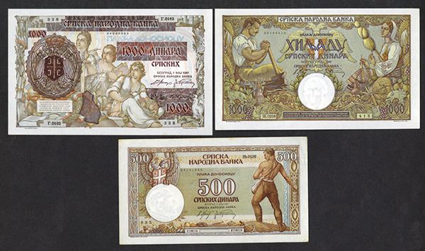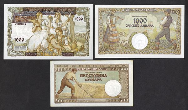 Serbia, lot includes 1000 Dinara on 500 Dinara, P-24; 500 Dinara, P-31; and 1000 Dinara, P-32. All UNC.