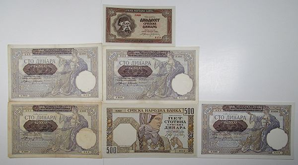 SerbiaÉ. Lot includes an assortment of 20, 100, 500, and 1000 Dinara issued under WWII German Occupation. P-23 (4); 24; 25; 27 (4); 31. Fine to VF. (11)