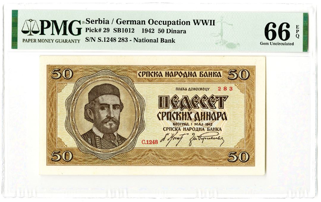 SerbiaÉ.. 1942, 50 Dinara, P-29, Issued banknote, Portrait of King Petar at left, S/N C1248-283, PMG graded Gem Uncirculated 66 EPQ.
