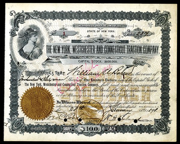 Serial Number One New York, Westchester & Connecticut Traction. Two Hundred & Thirty-Seven Shares. 1898. NY. S/N 1. Gold. Woman with starred tiara. VF+.