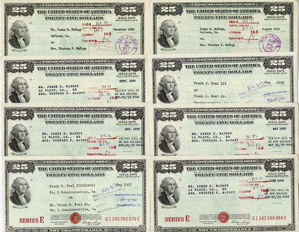 Louisiana and Washington, D.C., Lot of 8 bonds, all are Series E issued and cancelled bonds, George Washington at left, All were cancelled in New Orleans or Donaldsville, All are in VF to AU condition. BEP.